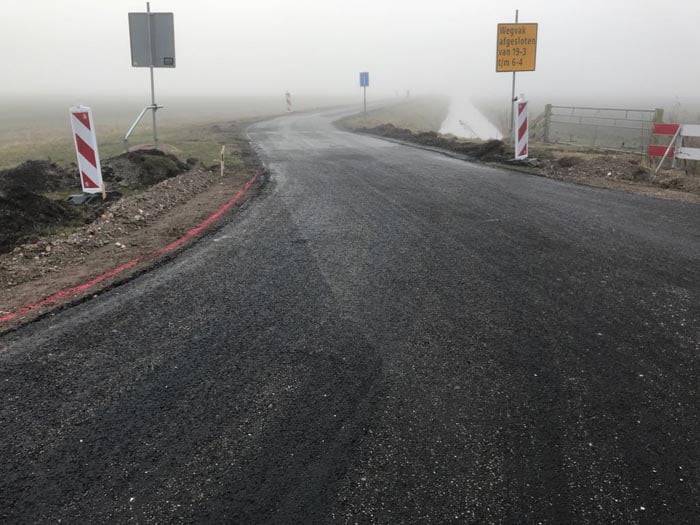 Voor deze weg heeft Schagen Infra ca. 600 ton geproduceerd en verwerkt. De afmetingen van het weggedeelte zijn ca.1500 mtr x 3,0 mtr breed 5 cm dikte. De weg wordt veel gebruikt door zwaar agrarisch verkeer de vezels hebben als doel het voorlomen van scheurvorming en spoorvorming.